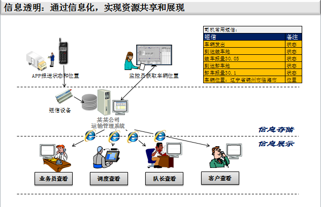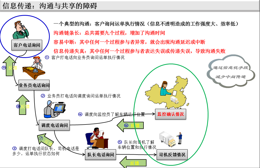 所有的浑水摸鱼,都是因为流程或制度不透明导致投机者有机可乘;而如果能做到信息透明公开,则能实现水至清则无鱼,让投机者无鱼可摸。我们来看以下两个情景。情景一:业务员跑到调度那边说,有个客户的货急着要发,能不能赶紧安排辆车;而调度说因为车辆都发出去了,暂时没法安排车辆,只能等最早发出的车回库再安排。不管业务员或者调度是否有私下原因(可能实际上经常会有),至少业务员和调度都各说各有理,但又互相不信任,然后留下各种矛盾隐患。实际上这是岗位之间职责不透明、信息无法共享造成的。在透明化管理中,不同岗位之间能做到相对透明,岗位之间互相制约,业务员不用去问调度,也能真实查看实际可用车辆资源;调度也不用业务员催促,也能按照订单的紧急程度顺序来指派车辆。我们情景二:客户想问某个订单的执行情况,于是打电话给业务员、业务员问调度、调度问车队长、队长打电话问在途司机,然后司机回复队长、然后到调度、到业务员、最终反馈给客户。从客户询问到获得最终结果,可能要花费几个小时甚至一两天。中间如果有某个岗位的员工暂时不在岗,则整个沟通就中断了。这是整个业务过程不透明、信息不通畅造成的。不同的岗位之间,各自掌握各自的信息,形成信息孤岛,岗位之间没有实现信息共享,相关岗位无法从其他岗位直接获取需要的信息。