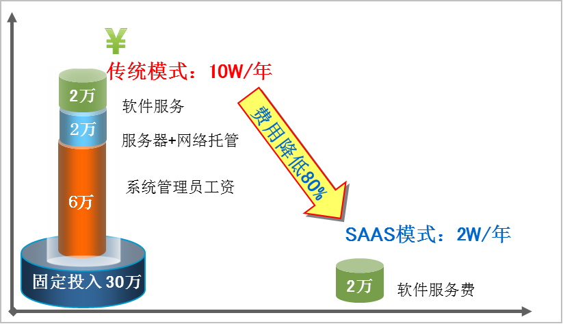 使用SaaS模式的软件,不需要购买几十万的软件使用权,不需要自建服务器,不需要企业级带宽,不需要购买昂贵的数据库版权,甚至连软件的日常维护都不需要专门人员,完全可以委托软件公司统一维护。